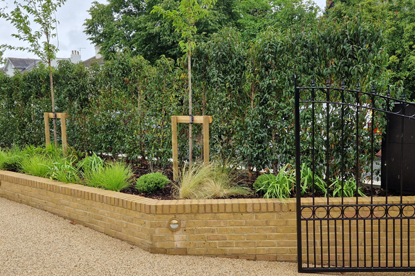 Front garden borders were replanted in a restful style, including a tall Portuguese Laurel hedge and columnar flowering Cherries.
