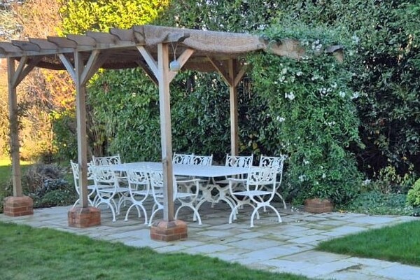 An Oak pergola provides a sheltered spot for sun or shade on warmer days.